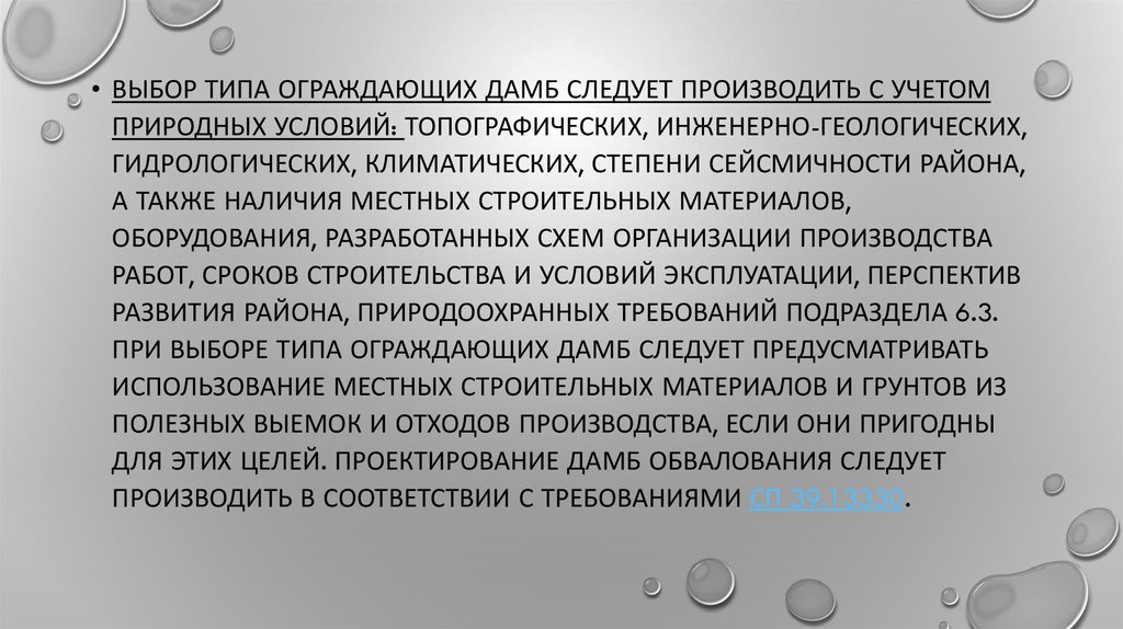 • ВЫБОР ТИПА ОГРАЖДАЮЩИХ ДАМБ СЛЕДУЕТ ПРОИЗВОДИТЬ С УЧЕТОМПРИРОДНЫХ УСЛОВИЙ: ТОПОГРАФИЧЕСКИХ, ИНЖЕНЕРНО-ГЕОЛОГИЧЕСКИХ,