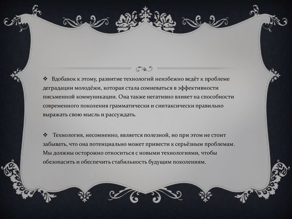 Вдобавок к этому, развитие технологий неизбежно ведёт к проблемедеградации молодёжи, которая стала сомневаться в эффективности