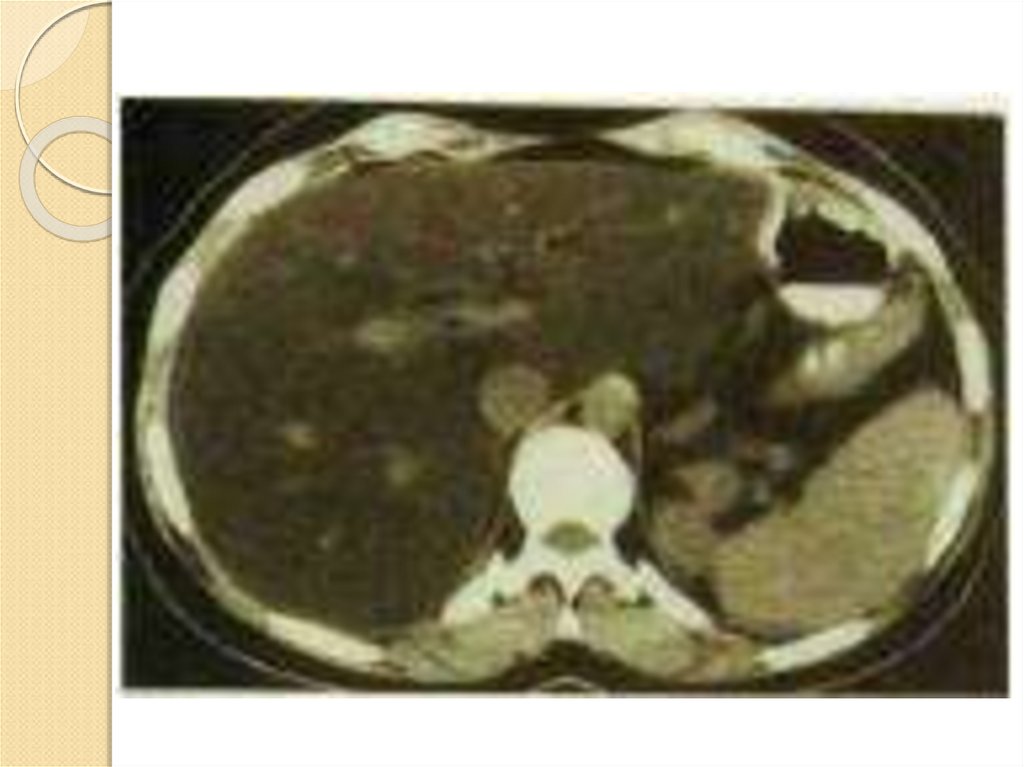 Компьютерная томограмма с контрастированием у больногос жировой печенью. Резко снижен коэффициент поглощения