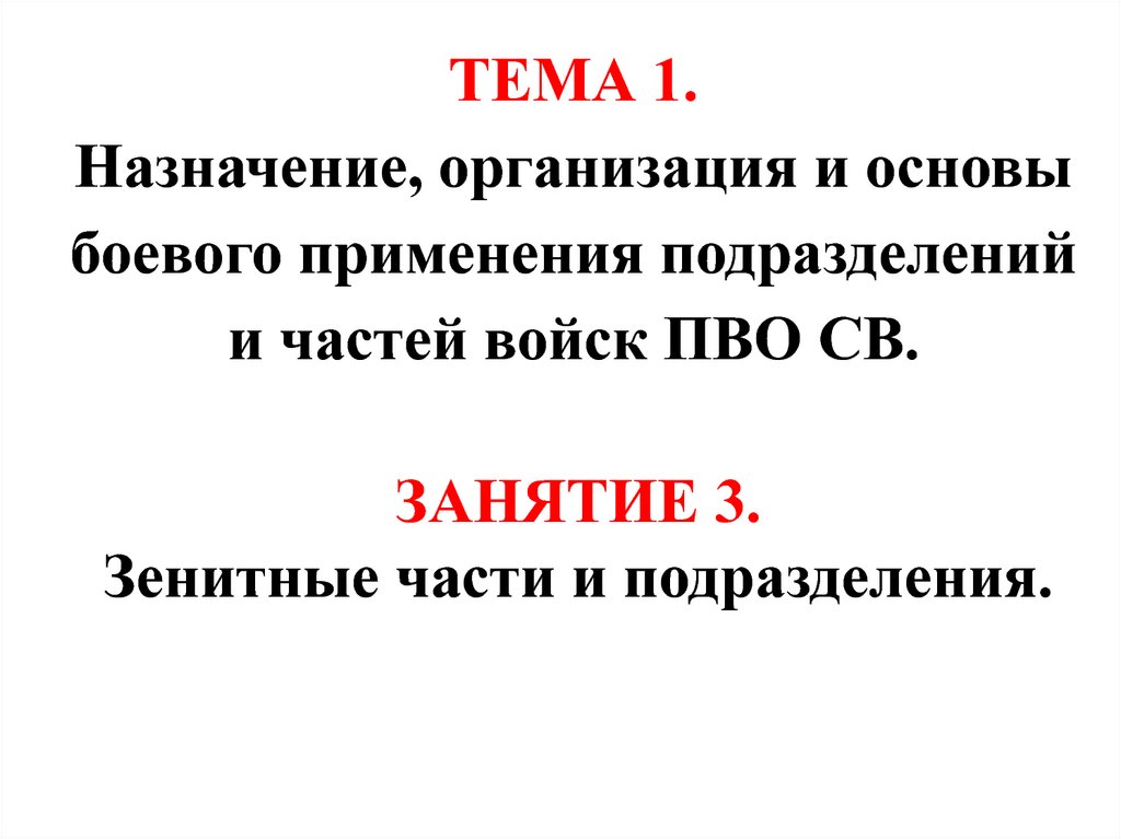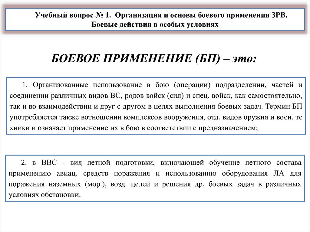 Учебный вопрос № 1. Организация и основы боевого применения ЗРВ.Боевые действия в особых условиях