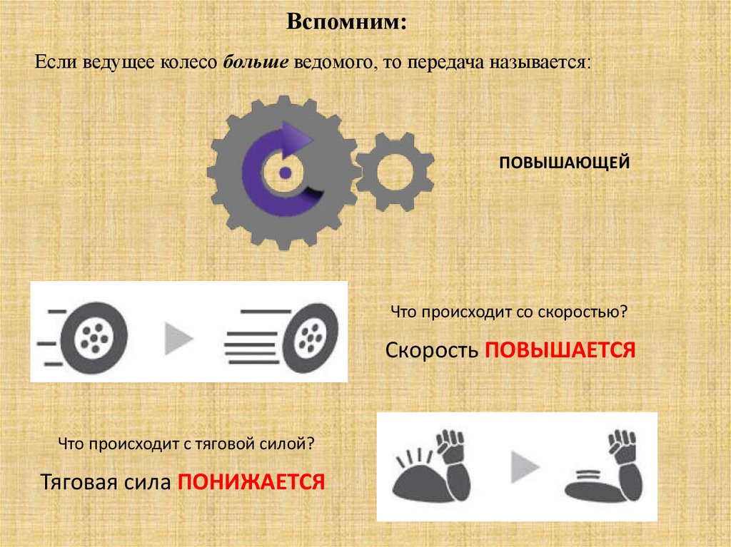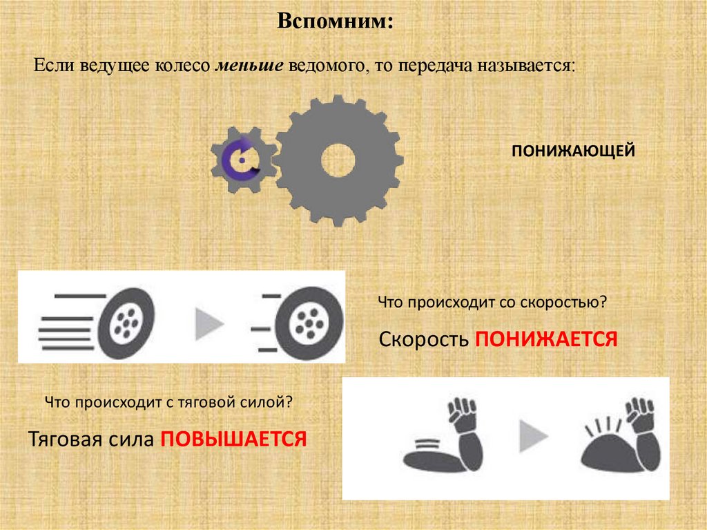 Вспомним:Если ведущее колесо меньше ведомого, то передача называется: