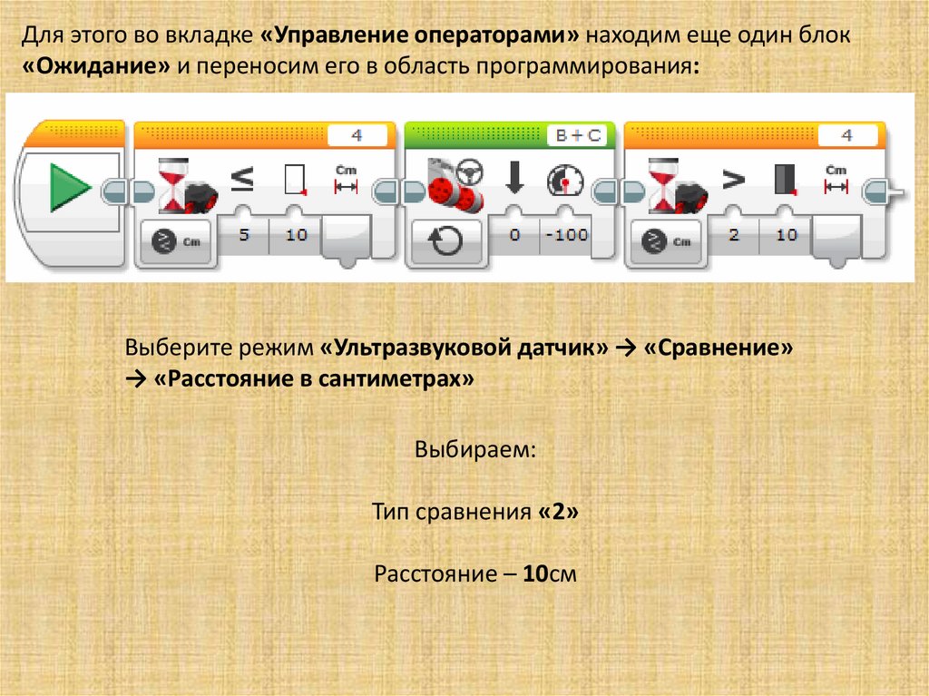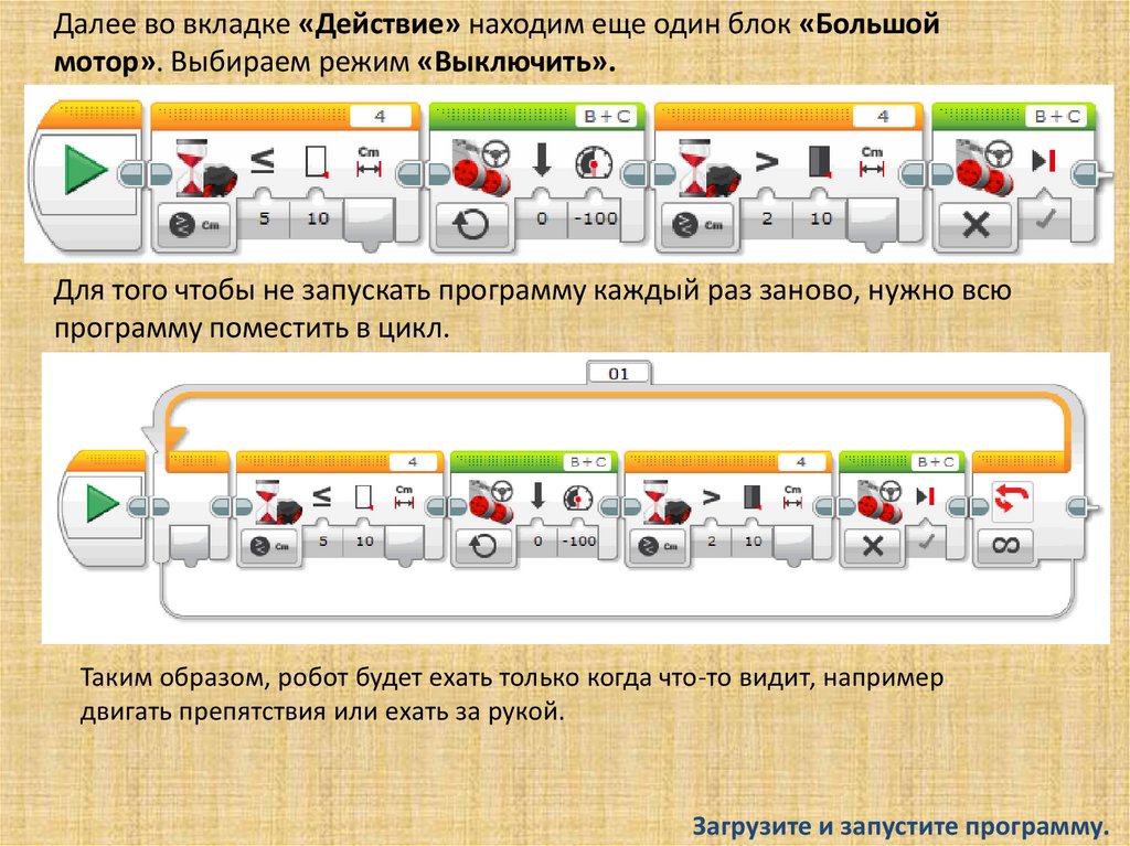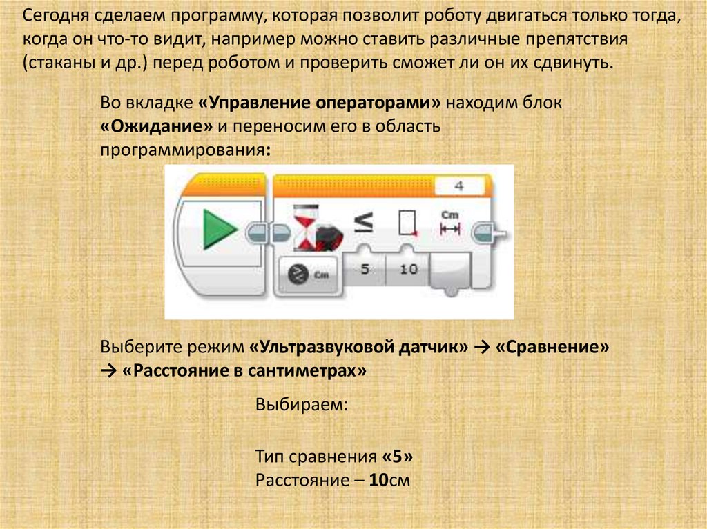 Сегодня сделаем программу, которая позволит роботу двигаться только тогда,когда он что-то видит, например можно ставить различные препятствия