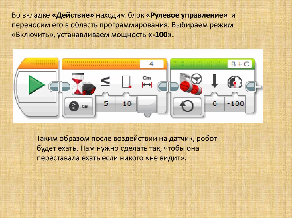 Во вкладке «Действие» находим блок «Рулевое управление» ипереносим его в область программирования. Выбираем режим