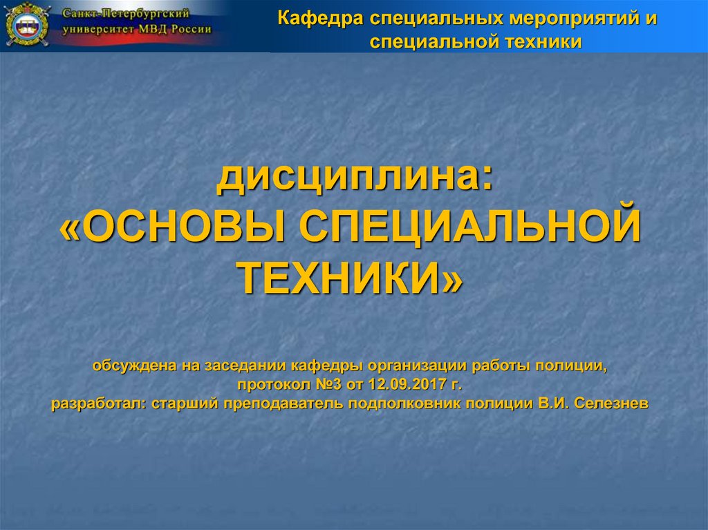 1. дисциплина: «ОСНОВЫ СПЕЦИАЛЬНОЙ ТЕХНИКИ» обсуждена на заседании кафедры организации работы полиции, протокол №3 от 12.09.2017