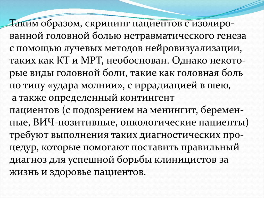 Таким образом, скрининг пациентов с изолированной головной болью нетравматического генезас помощью лучевых методов нейровизуализации,