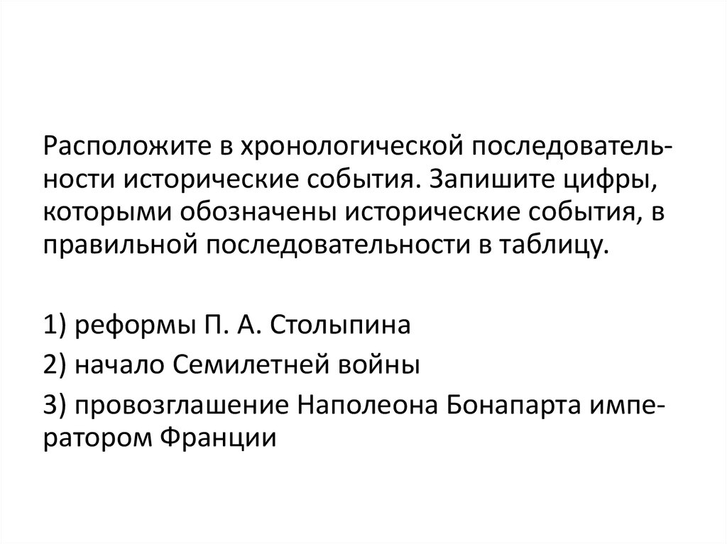 Расположите в хронологической последовательности исторические события. Запишите цифры,которыми обозначены исторические события, в