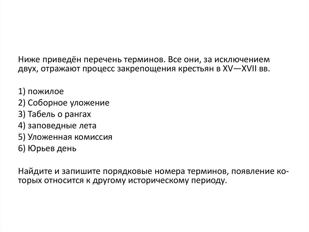 Ниже приведён перечень терминов. Все они, за исключениемдвух, отражают процесс закрепощения крестьян в XV—XVII вв.