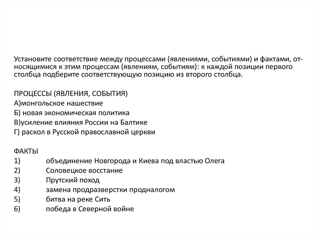 Установите соответствие между процессами (явлениями, событиями) и фактами, относящимися к этим процессам (явлениям, событиям): к каждой позиции первогостолбца подберите соответствующую позицию из второго столбца.
