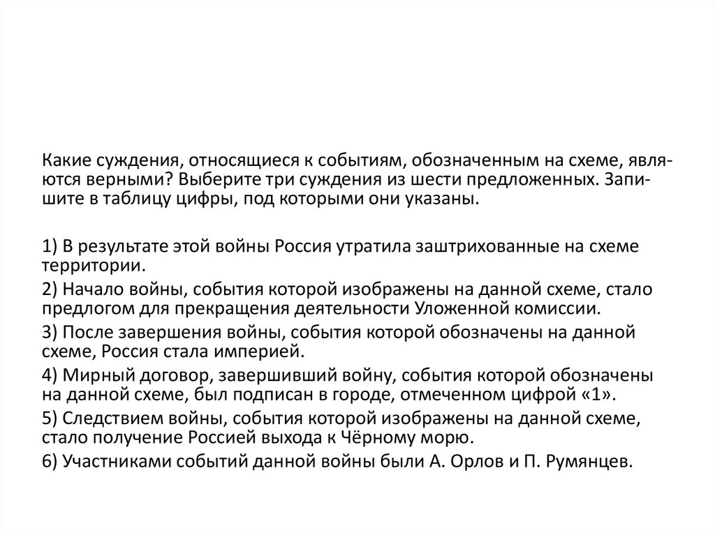 Какие суждения, относящиеся к событиям, обозначенным на схеме, являются верными? Выберите три суждения из шести предложенных. Запишите в таблицу цифры, под которыми они указаны.1) В результате этой войны Россия утратила заштрихованные на схеме