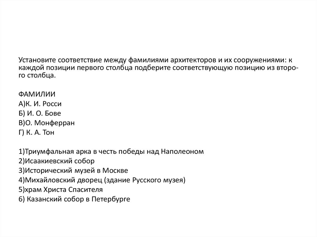 Установите соответствие между фамилиями архитекторов и их сооружениями: ккаждой позиции первого столбца подберите соответствующую позицию из второго столбца.