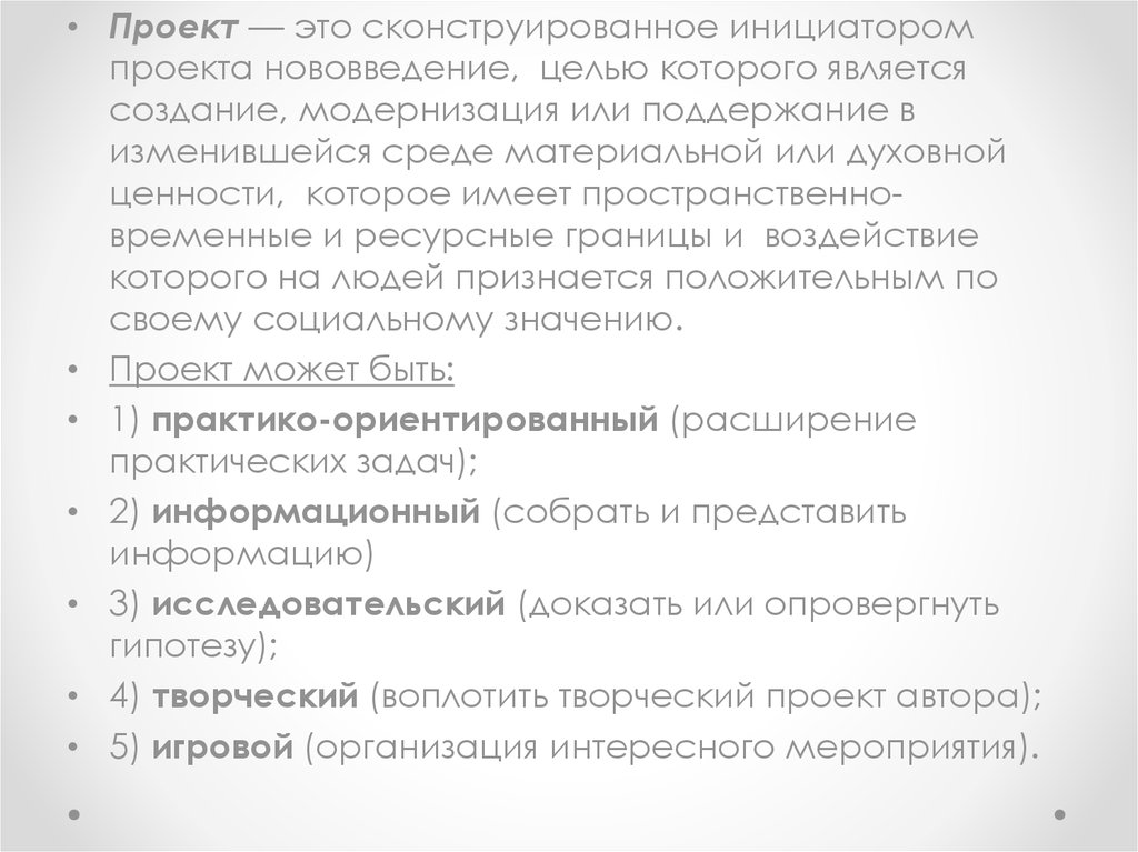 • Проект — это сконструированное инициаторомпроекта нововведение, целью которого является