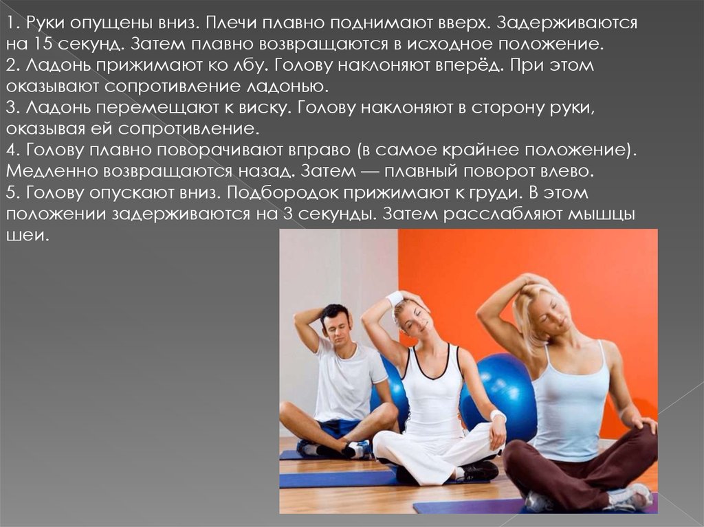 1. Руки опущены вниз. Плечи плавно поднимают вверх. Задерживаютсяна 15 секунд. Затем плавно возвращаются в исходное положение.