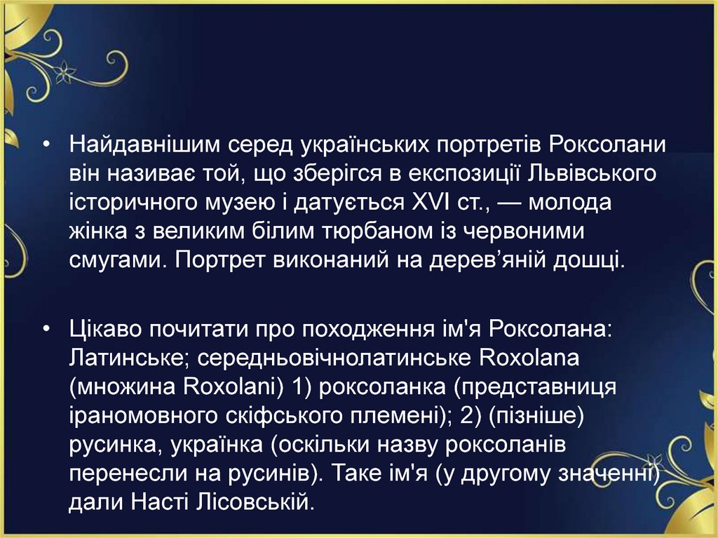 • Найдавнішим серед українських портретів Роксоланивін називає той, що зберігся в експозиції Львівського