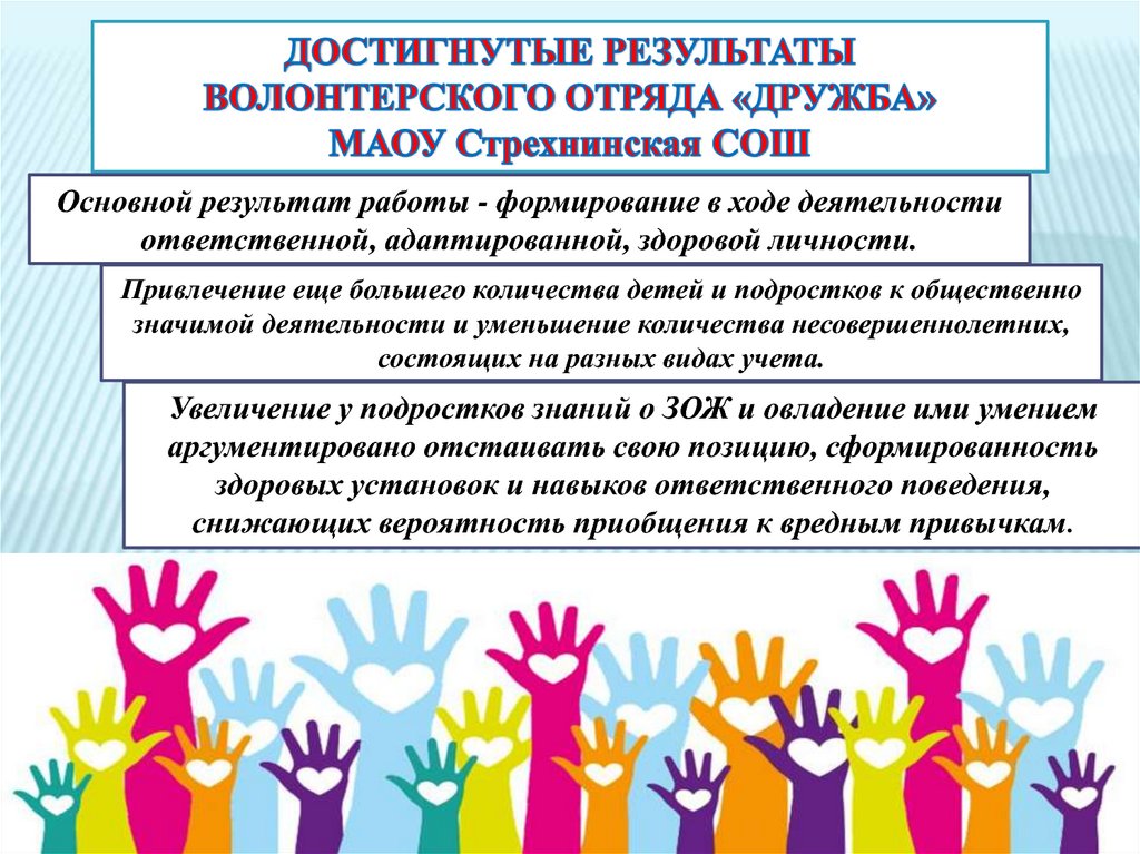 Основной результат работы - формирование в ходе деятельностиответственной, адаптированной, здоровой личности.
