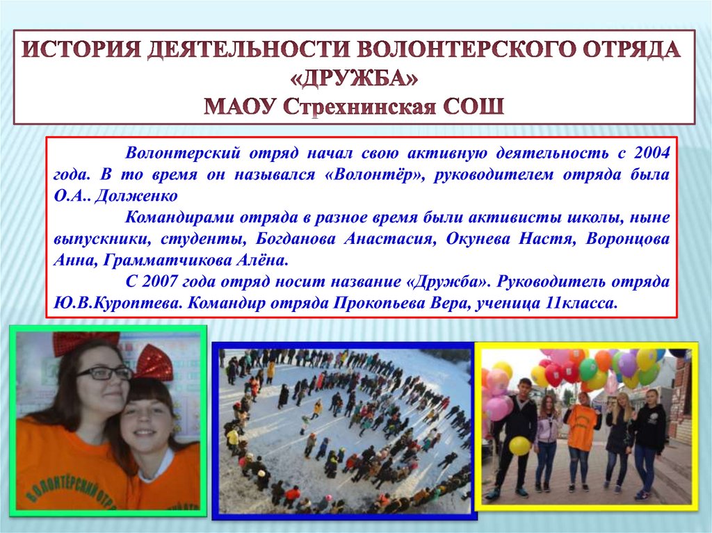 Волонтерский отряд начал свою активную деятельность с 2004года. В то время он назывался «Волонтёр», руководителем отряда была