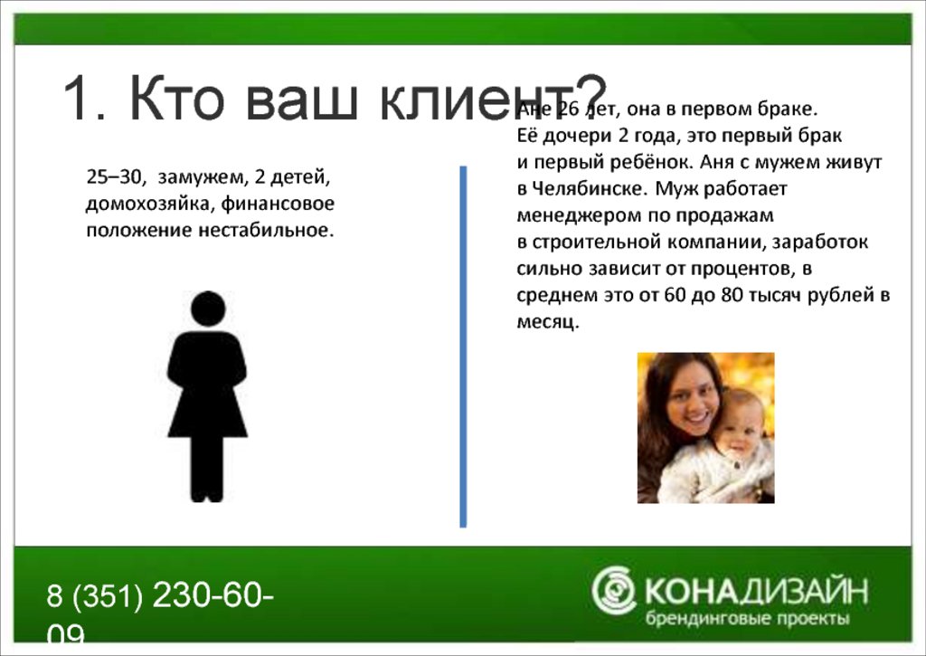 1. Кто ваш клиент?25–30, замужем, 2 детей,