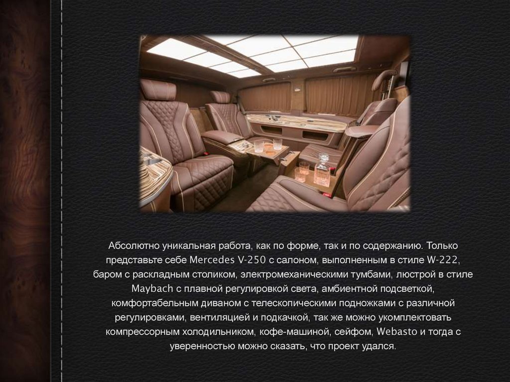 Абсолютно уникальная работа, как по форме, так и по содержанию. Толькопредставьте себе Mercedes V-250 с салоном, выполненным в стиле W-222,