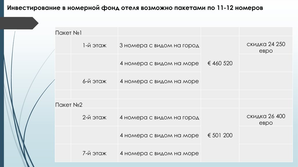 Инвестирование в номерной фонд отеля возможно пакетами по 11-12 номеровПакет №1