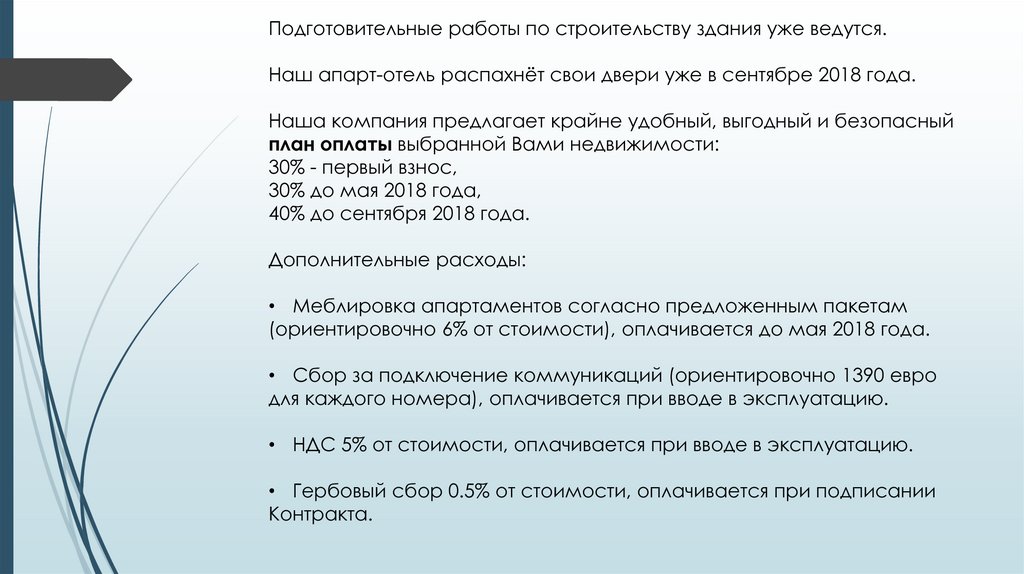 • НДС 5% от стоимости, оплачивается при вводе в эксплуатацию.