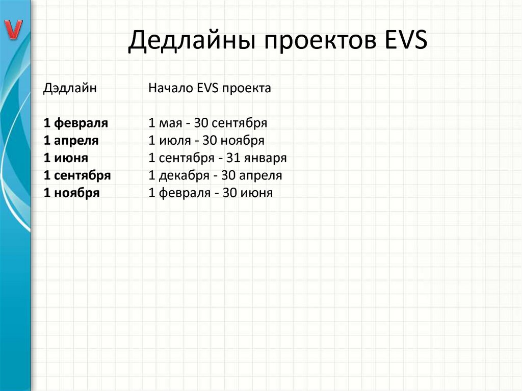 Дедлайны проектов EVSДэдлайн
