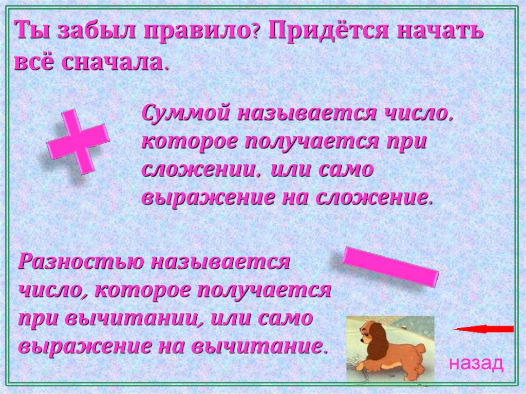 Здравствуй, дружок!Ты уже знаешь, что такое «сумма» и «разность»?