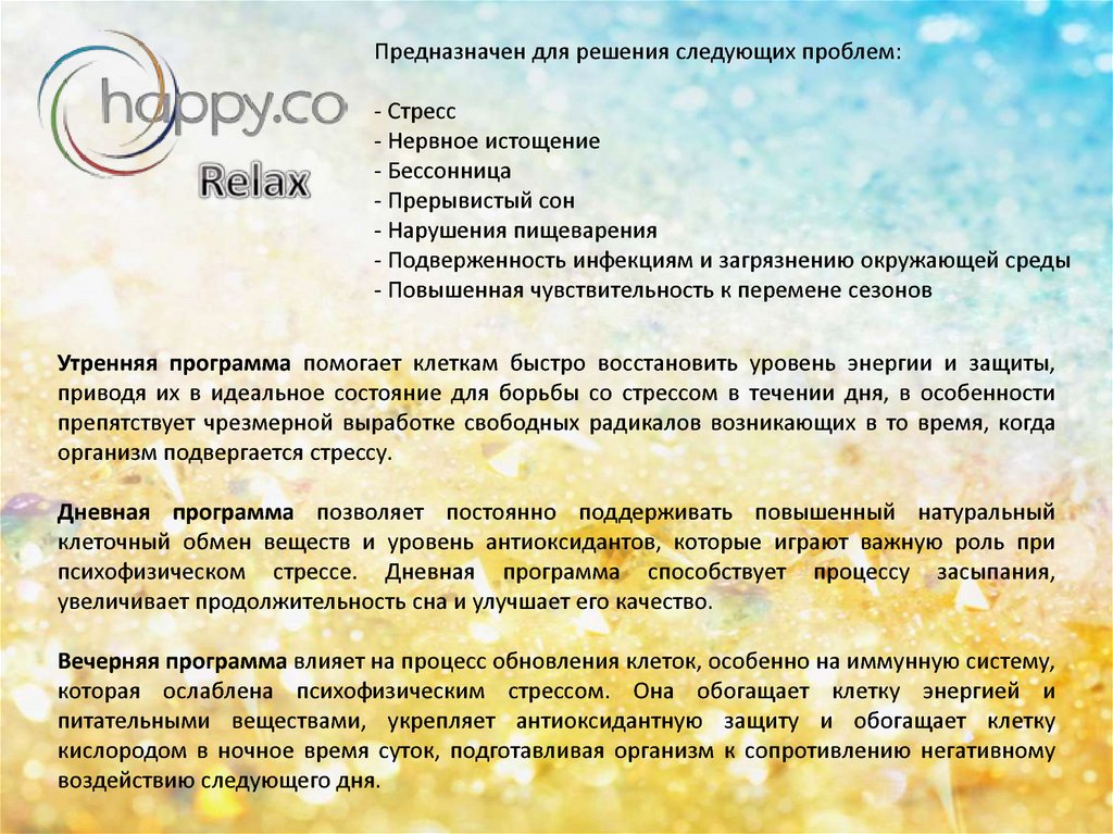Предназначен для решения следующих проблем:- Стресс