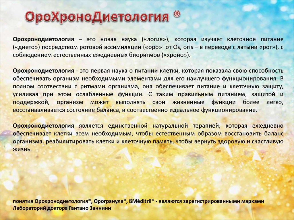 Орохронодиетология – это новая наука («логия»), которая изучает клеточное питание(«дието») посредством ротовой ассимиляции («оро»: от Os, oris – в переводе с латыни «рот»), с