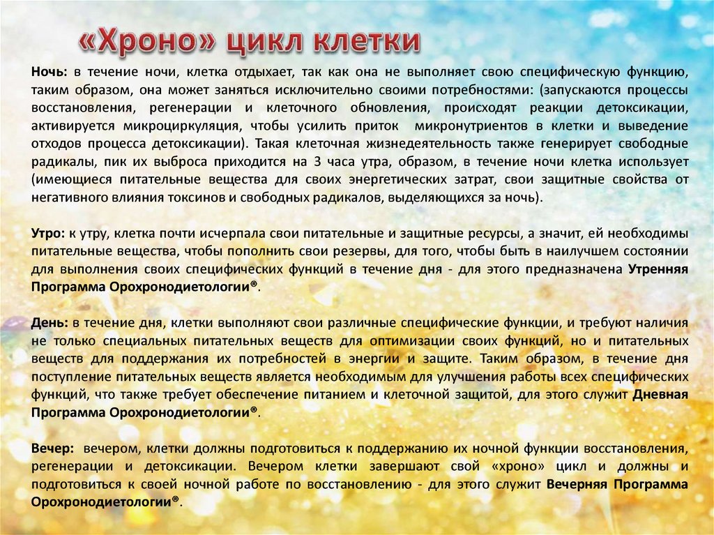 регенерации и детоксикации. Вечером клетки завершают свой «хроно» цикл и должны и