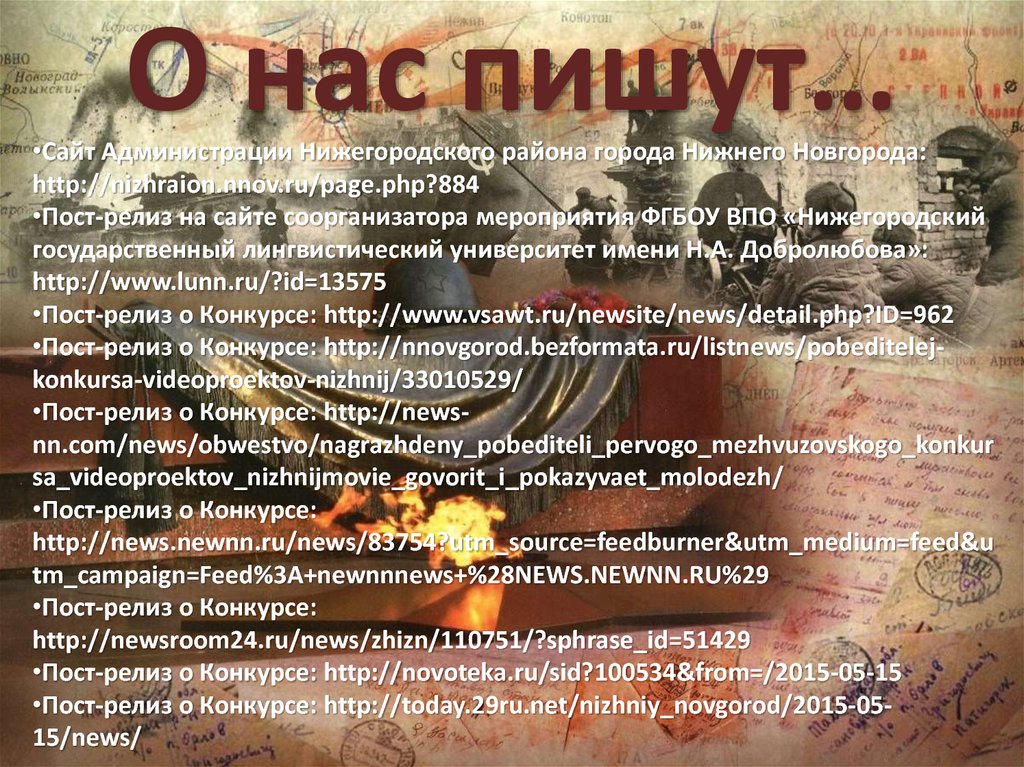 •Пост-релиз о Конкурсе: http://nnovgorod.bezformata.ru/listnews/pobeditelejkonkursa-videoproektov-nizhnij/33010529/