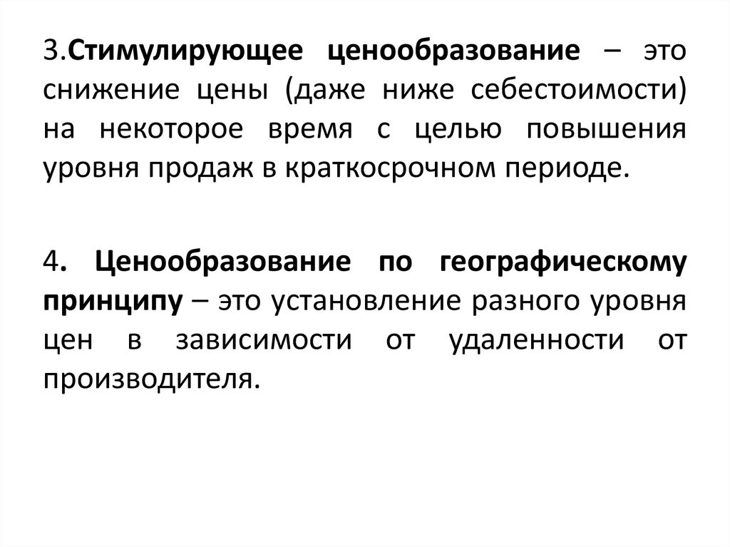 3.Стимулирующее ценообразование – этоснижение цены (даже ниже себестоимости)