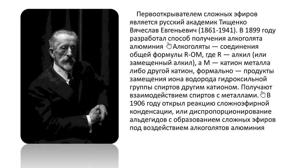 Первооткрывателем сложных эфировявляется русский академик Тищенко