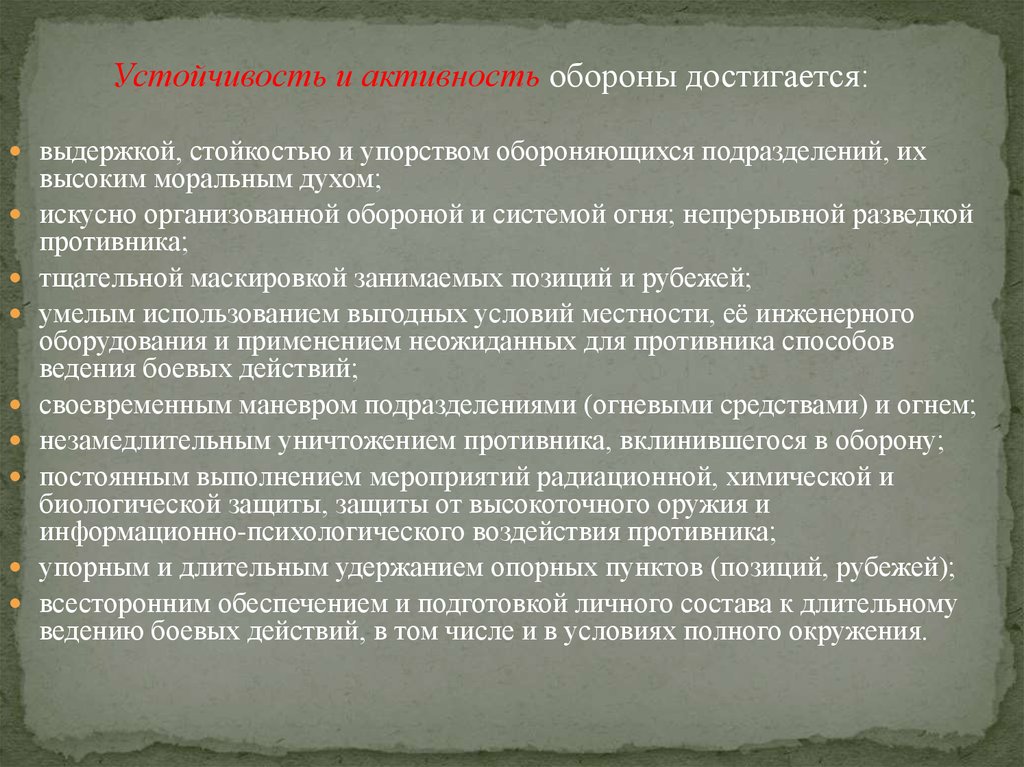 Устойчивость и активность обороны достигается:выдержкой, стойкостью и упорством обороняющихся подразделений, их