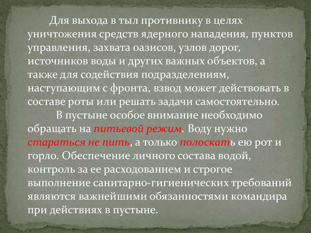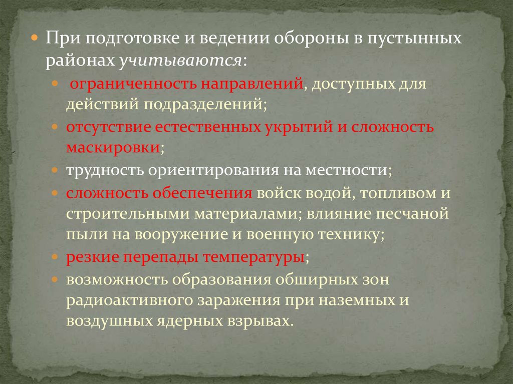 При подготовке и ведении обороны в пустынныхрайонах учитываются:
