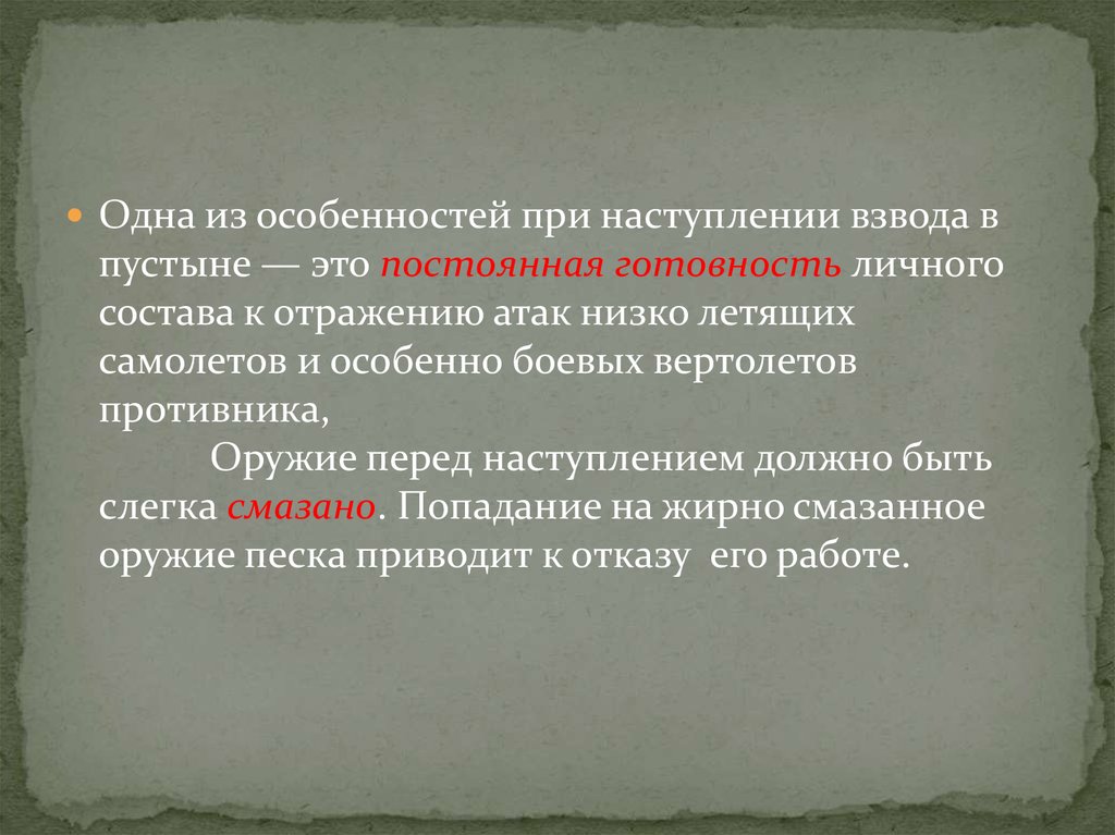 Одна из особенностей при наступлении взвода впустыне — это постоянная готовность личного