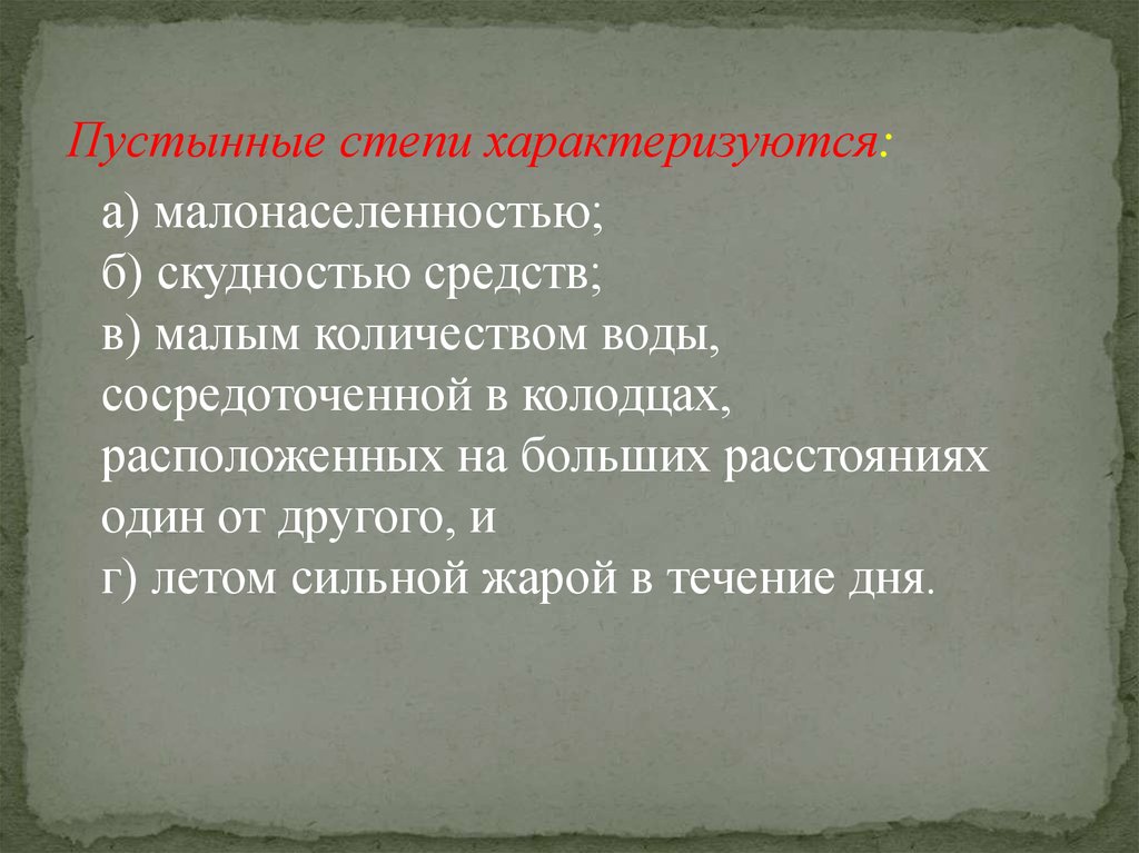 Пустынные степи характеризуются:а) малонаселенностью;