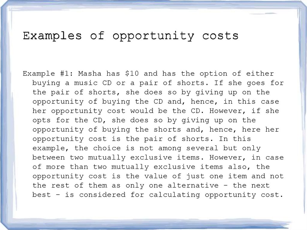 Examples of opportunity costsExample #1: Masha has $10 and has the option of either