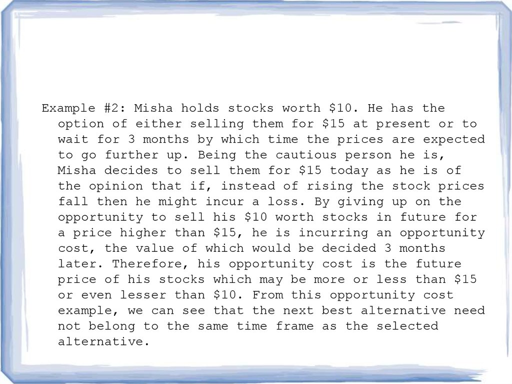 Example #2: Misha holds stocks worth $10. He has theoption of either selling them for $15 at present or to