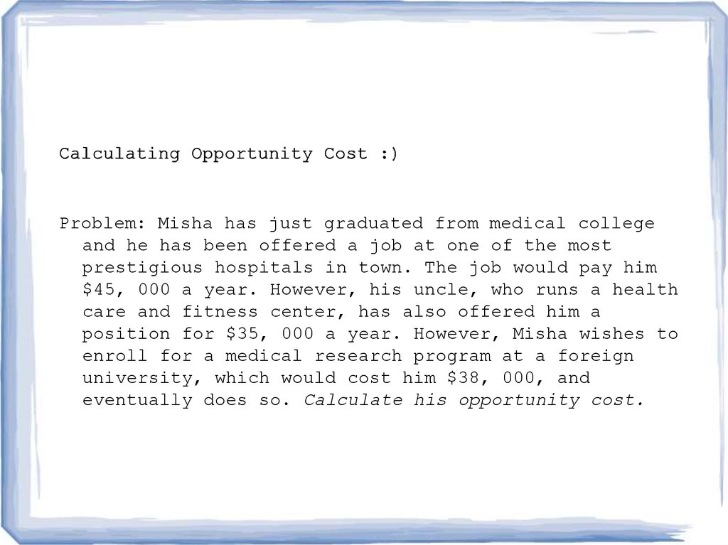 Calculating Opportunity Cost :)Problem: Misha has just graduated from medical college