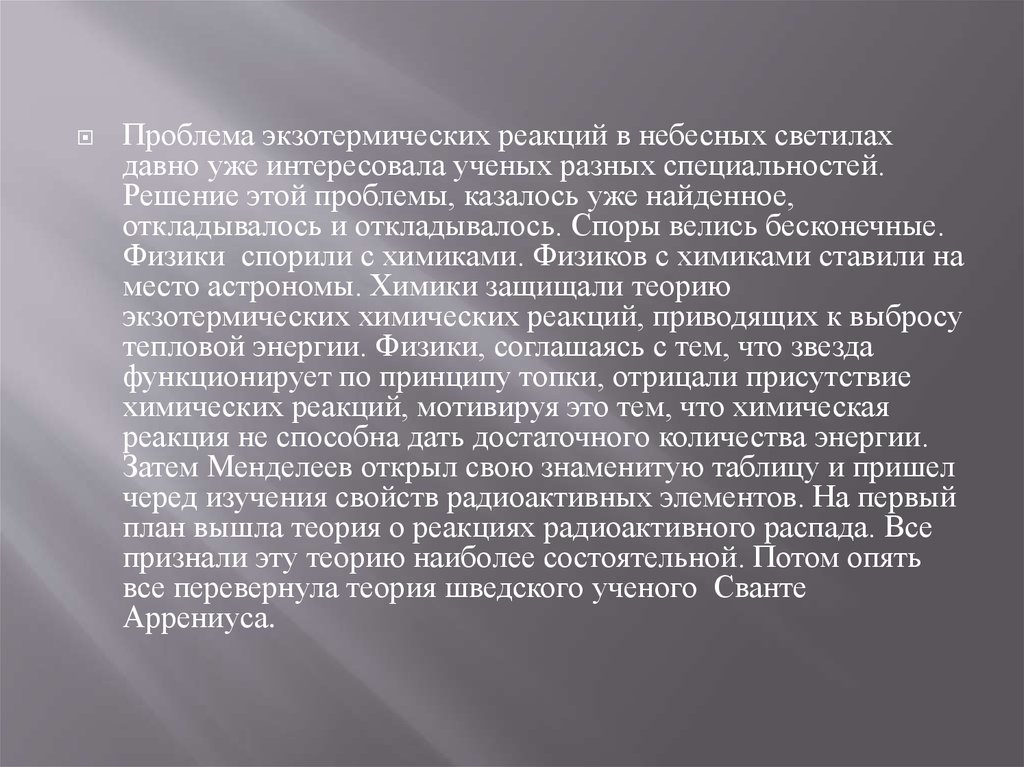 Проблема экзотермических реакций в небесных светилахдавно уже интересовала ученых разных специальностей.