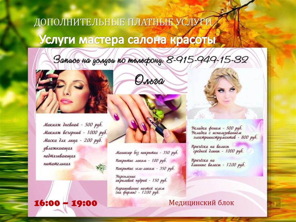 ДОПОЛНИТЕЛЬНЫЕ ПЛАТНЫЕ УСЛУГИ16:00 – 19:00