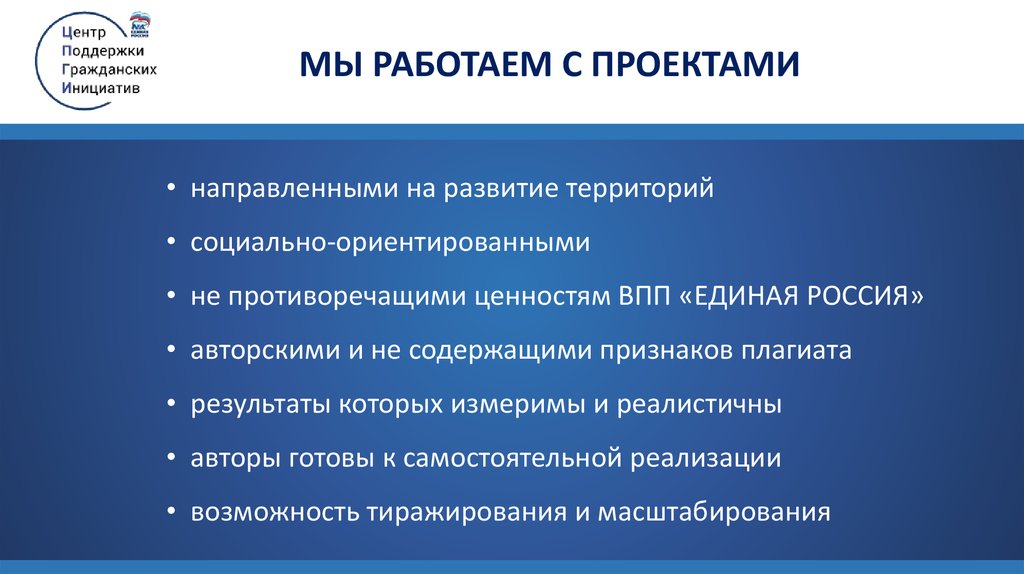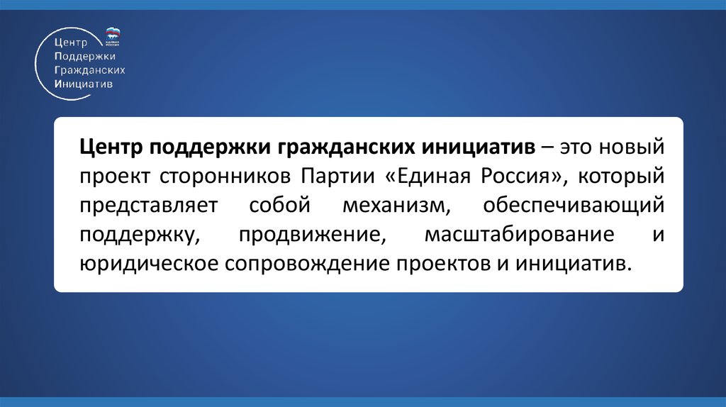 Центр поддержки гражданских инициатив – это новыйпроект сторонников Партии «Единая Россия», который