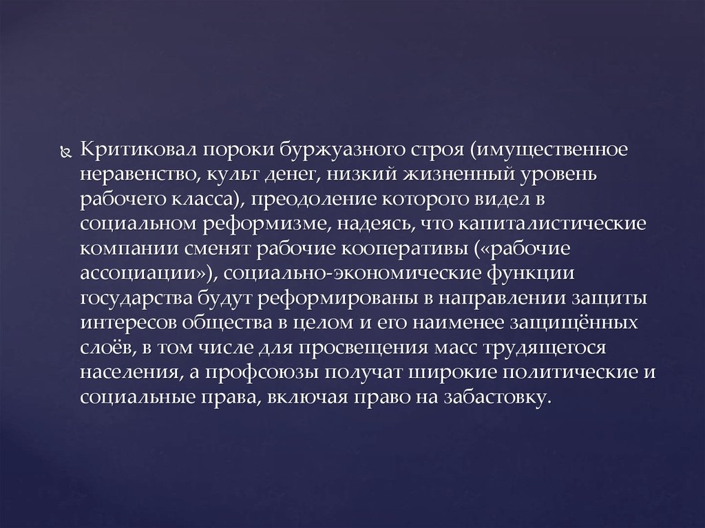 Критиковал пороки буржуазного строя (имущественноенеравенство, культ денег, низкий жизненный уровень