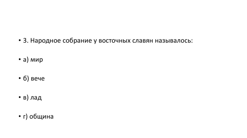 • 3. Народное собрание у восточных славян называлось:• а) мир