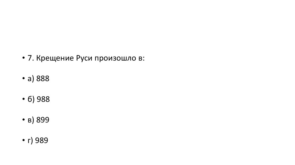 • 7. Крещение Руси произошло в:• а) 888