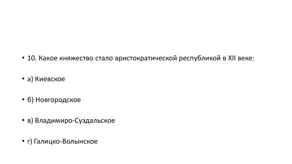 • 10. Какое княжество стало аристократической республикой в XII веке:• а) Киевское