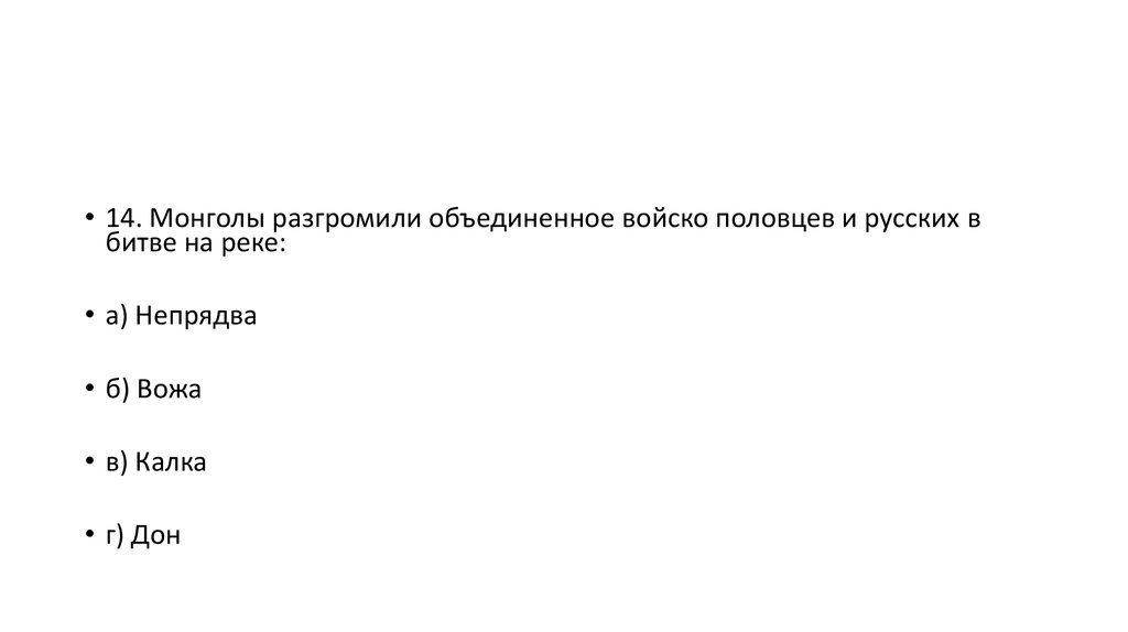 • 14. Монголы разгромили объединенное войско половцев и русских вбитве на реке: