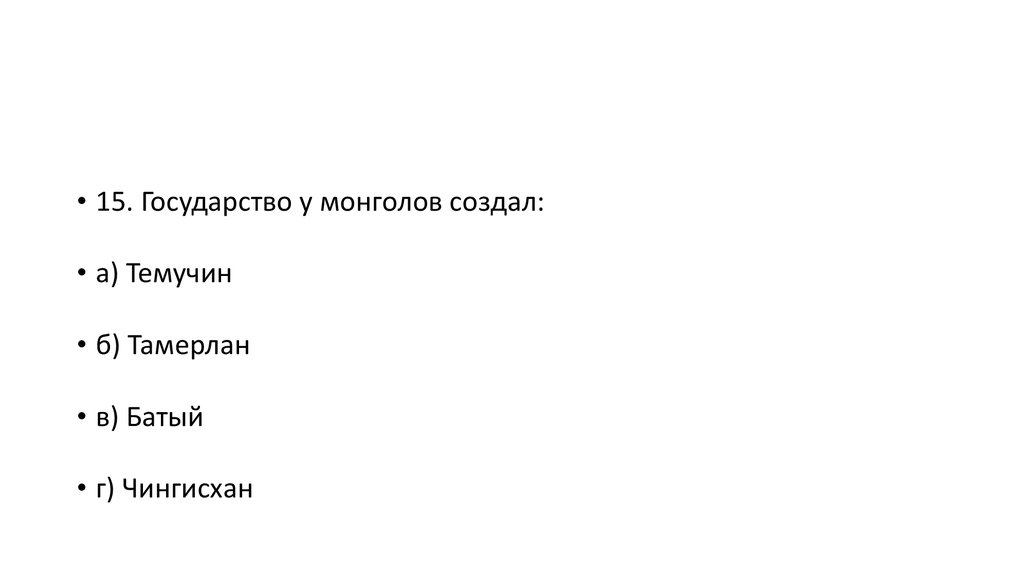 • 15. Государство у монголов создал:• а) Темучин