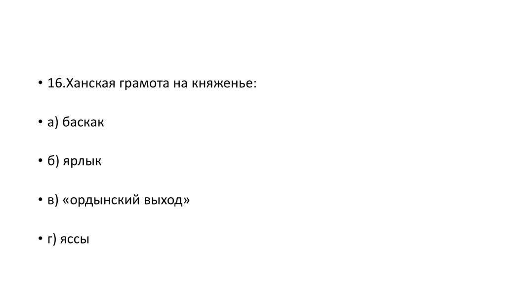 • 16.Ханская грамота на княженье:• а) баскак