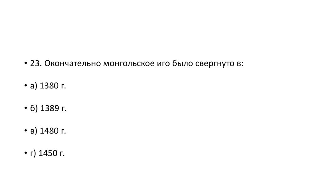 • 23. Окончательно монгольское иго было свергнуто в:• а) 1380 г.
