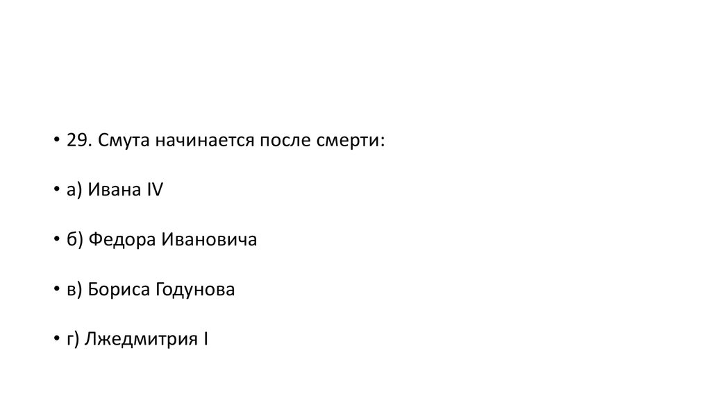 • 29. Смута начинается после смерти:• а) Ивана IV